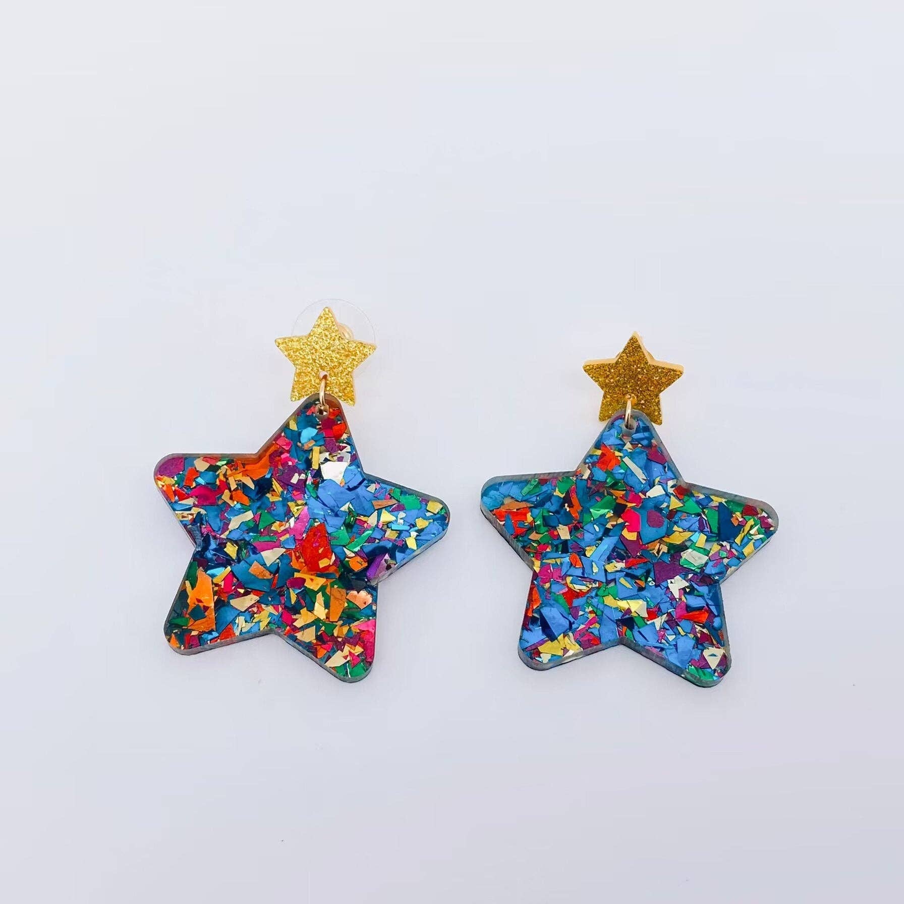 Bring bold sparkle to your holiday season with these Holiday Starburst Glitter Earrings. Each pair features vibrant, rainbow-flecked acrylic stars paired with golden glitter star studs—creating a statement piece that’s bright, joyful, and full of personality.