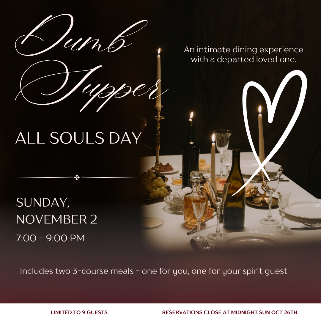 The Dumb Supper is an ancient ritual of silence and devotion. At this gathering, each guest chooses one departed loved one to invite. A seat will be set beside them, and a three-course meal will be served in their honor. The supper will unfold in reverse order, as tradition dictates: