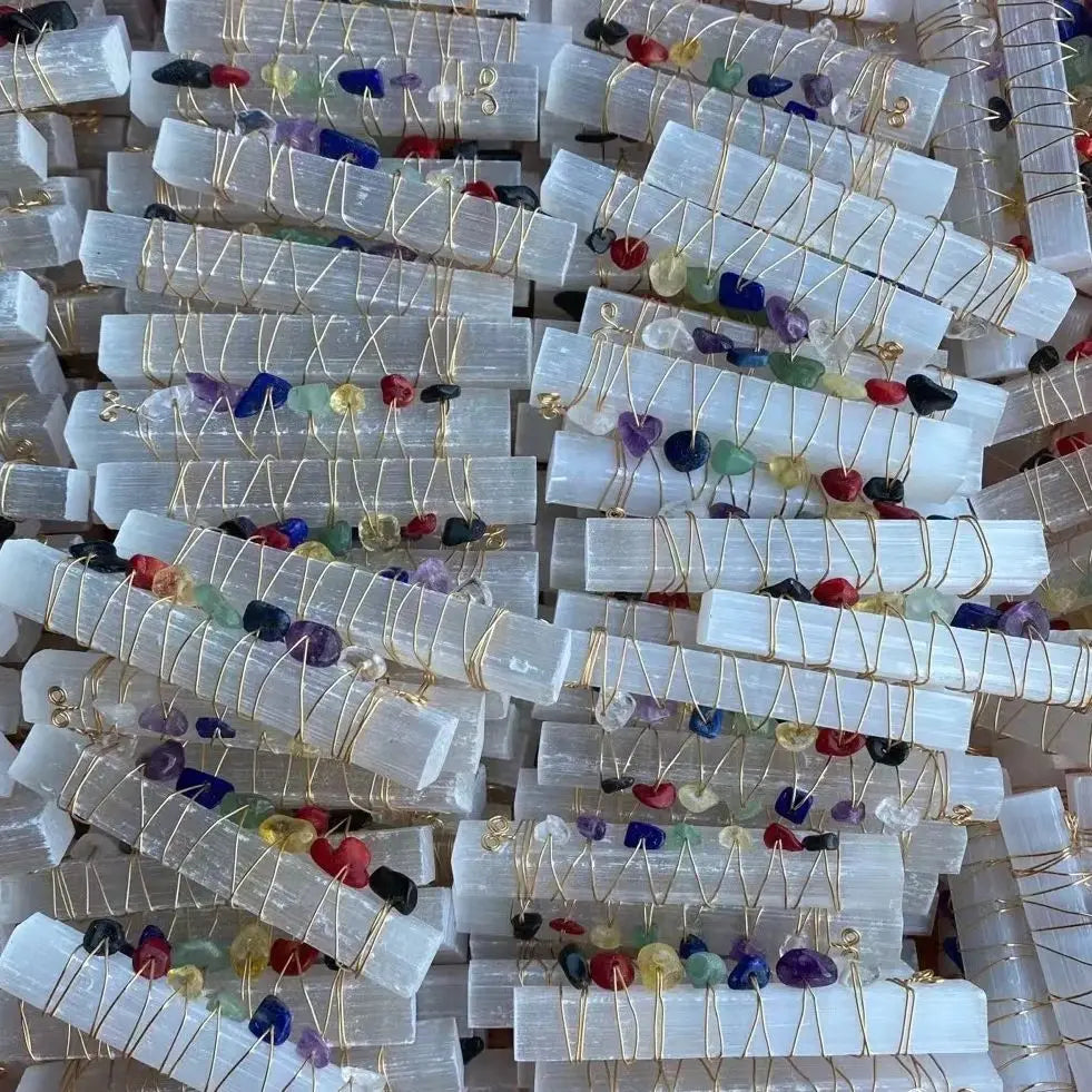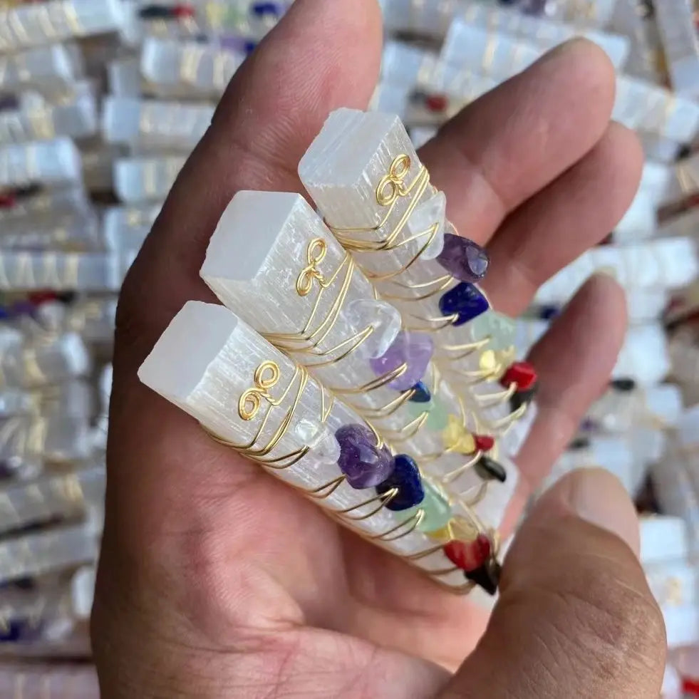 Harness the power of energy healing with this stunning Seven Chakra Selenite Wand. Handcrafted with vibrant chakra stones and wrapped in copper wire, this wand is designed to align and balance your energy centers. Selenite, known for its cleansing and protective properties, enhances spiritual clarity and promotes inner peace. Perfect for meditation, Reiki, or energy work, this wand is both a practical tool and a beautiful addition to your sacred space. Ideal for spiritual practitioners, crystal enthusiasts, or as a unique gift for those on a healing journey.